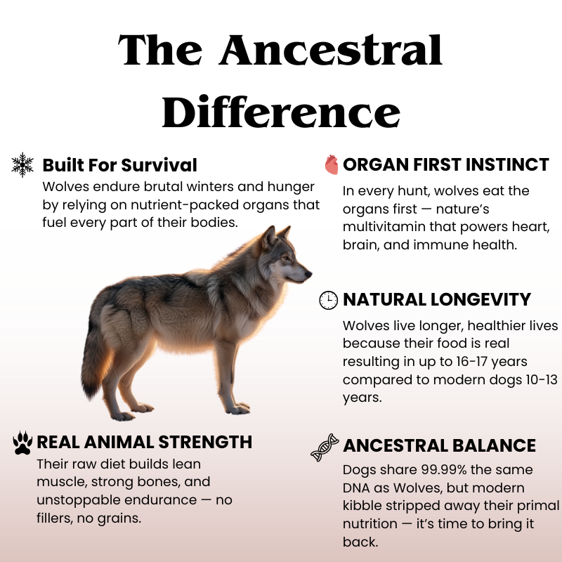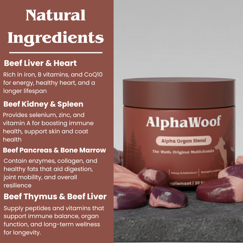 These nutrient-rich parts fueled their strength, endurance, and longevity, giving them everything they needed to thrive in the wild. AlphaWoof brings that same primal nutrition back to your dog’s bowl.